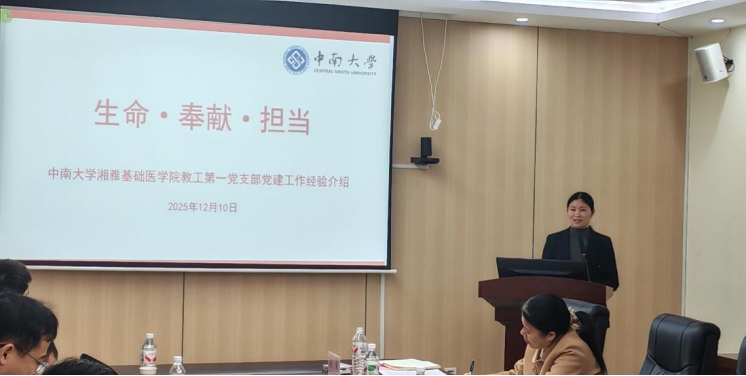湘雅基础医日本av女优教工第一支部建设经验介绍》为题,分享其所在支部创建教育部第三批“全国党建工作样板支部”并于2024年11月顺利通过验收的实践经验。她结合教学科研与社会服务中的具体案例,生动展示了党建如何赋能业务发展,实现“一个支部一座堡垒,一名党员一面旗帜”的实践案例。